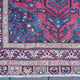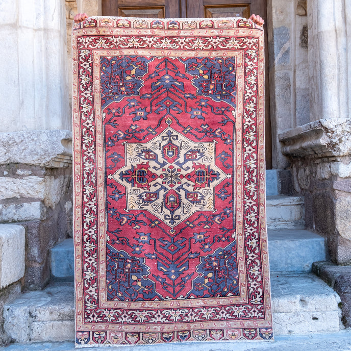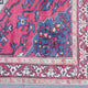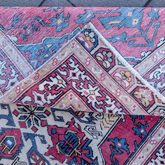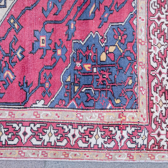 This Turkish handwoven vintage rug has a beautiful deep pink background with periwinkle, black, and neutral accents. Konya.