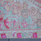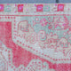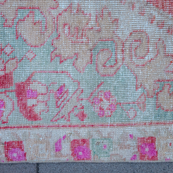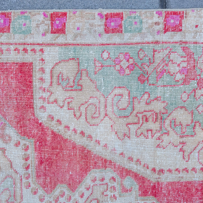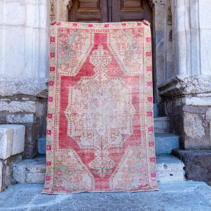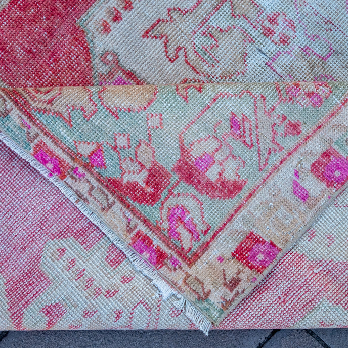 This Turkish handwoven vintage rug has a beautiful red background with pink, green, and neutral accents. Avonoz.
