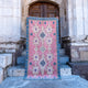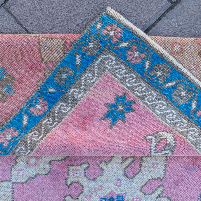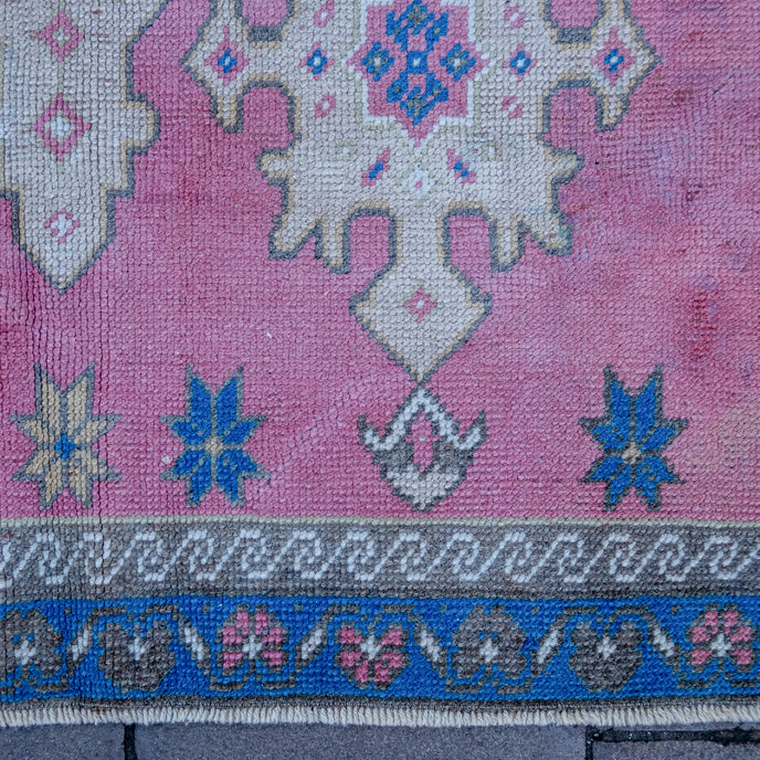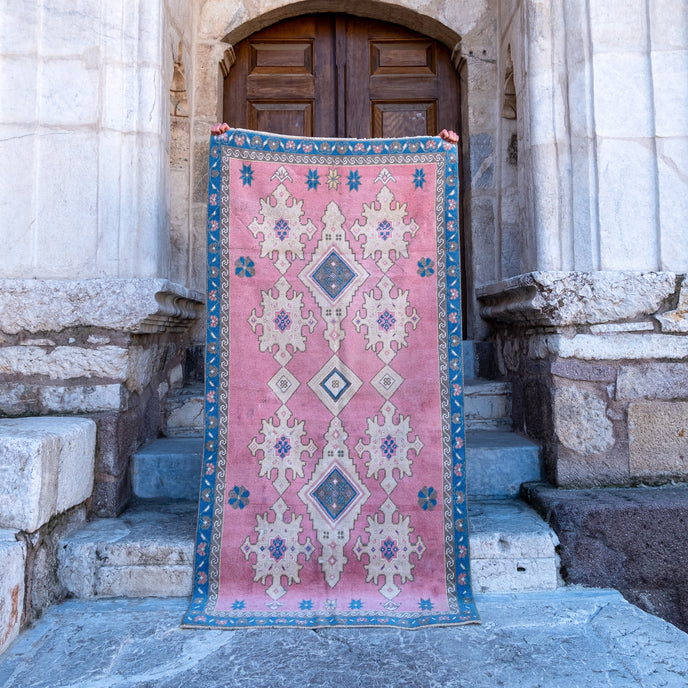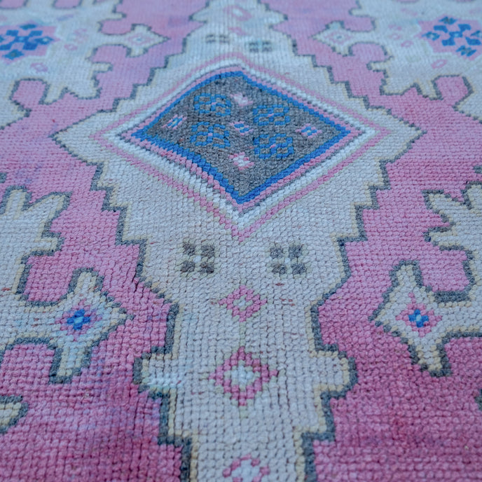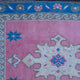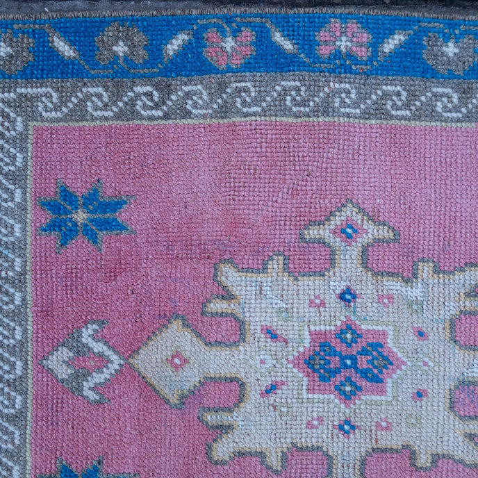 This Turkish handwoven vintage rug has a beautiful pink background with neutral and blue accents. Kars.