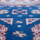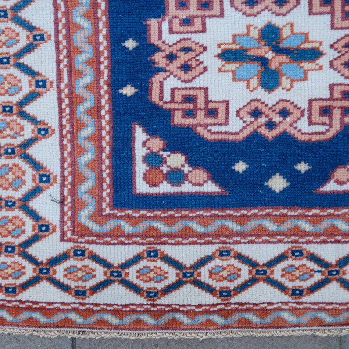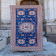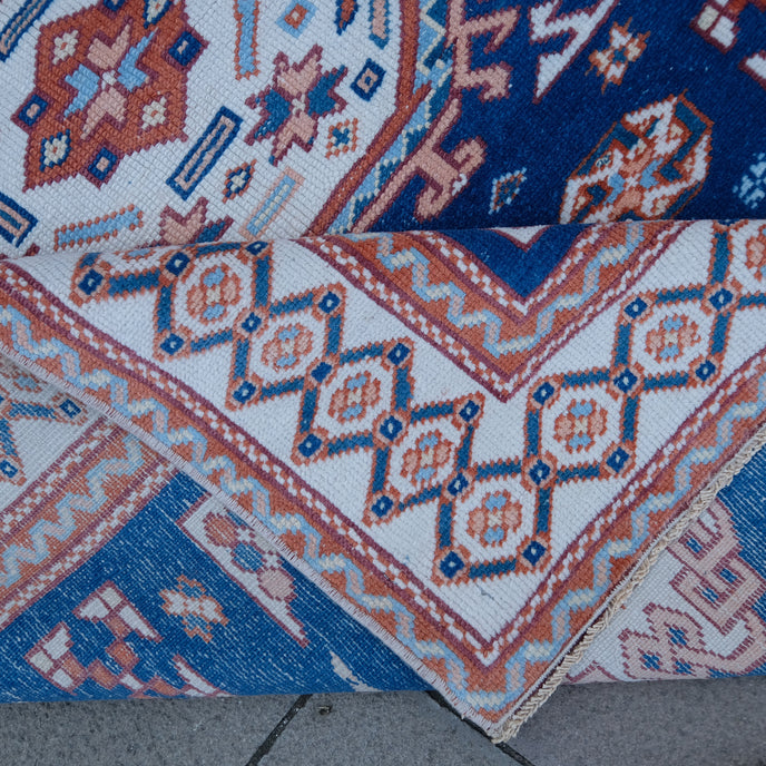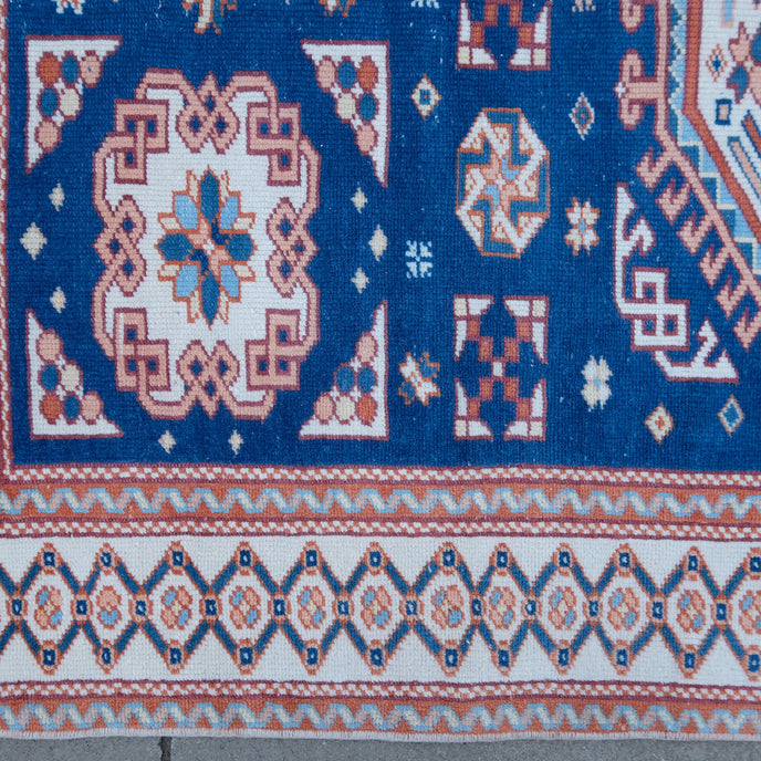 This Turkish handwoven vintage rug has a beautiful blue background with neutral, rust and peach accents. Çanakkale.