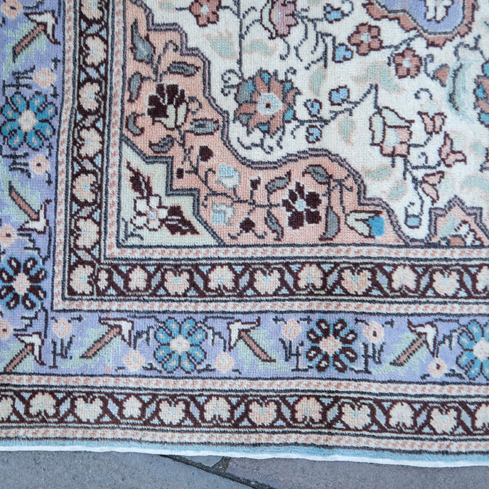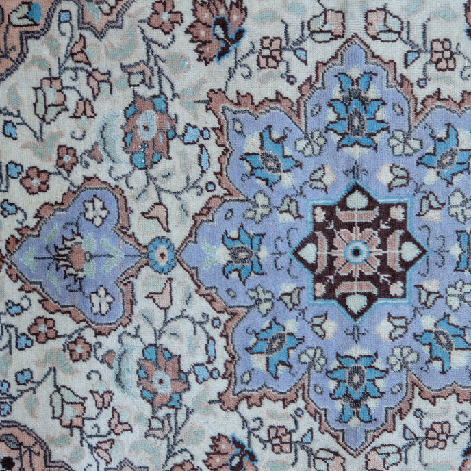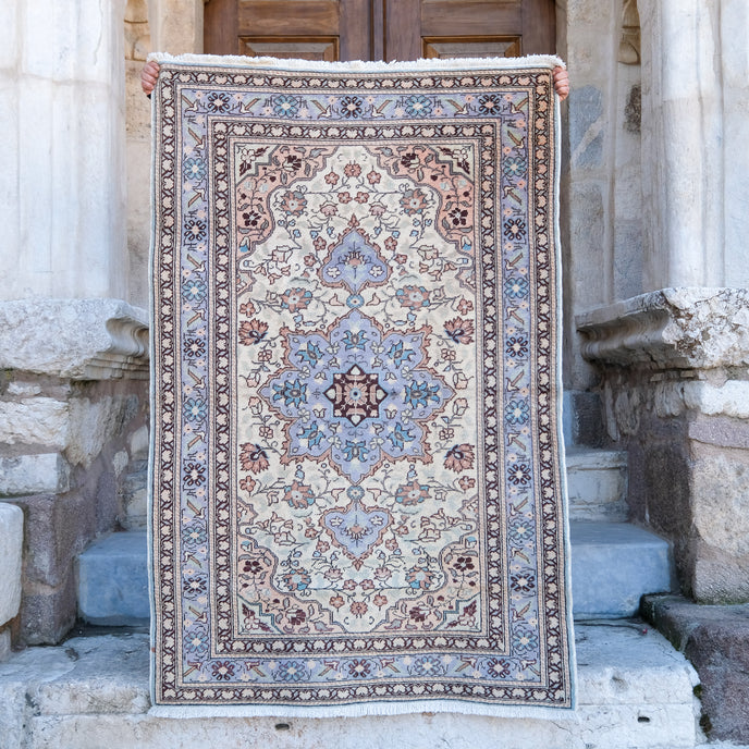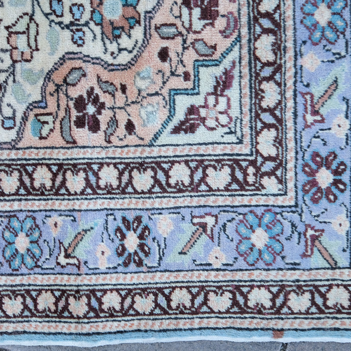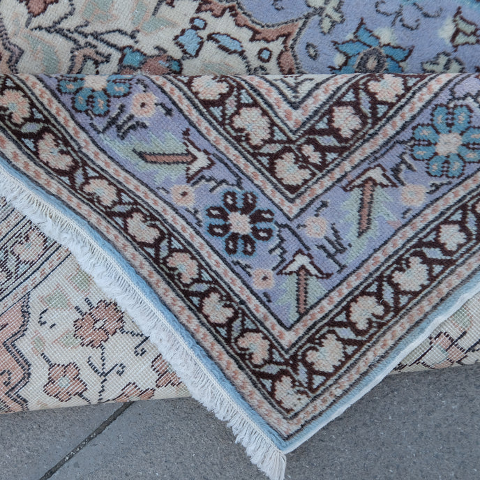 This Turkish handwoven vintage rug has a beautiful blue background with pink and neutral accents. Kayseri.