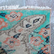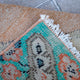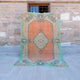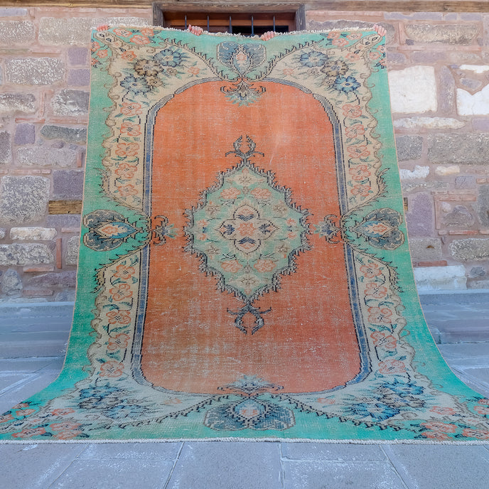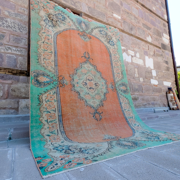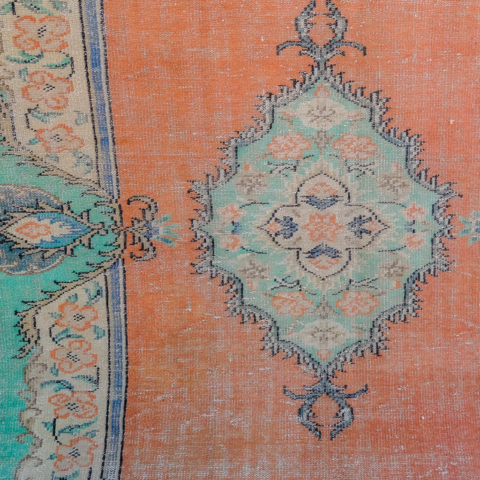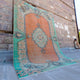 This Turkish handwoven vintage rug has a beautiful orange background with minty blue and neutral accents. Demirci.