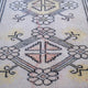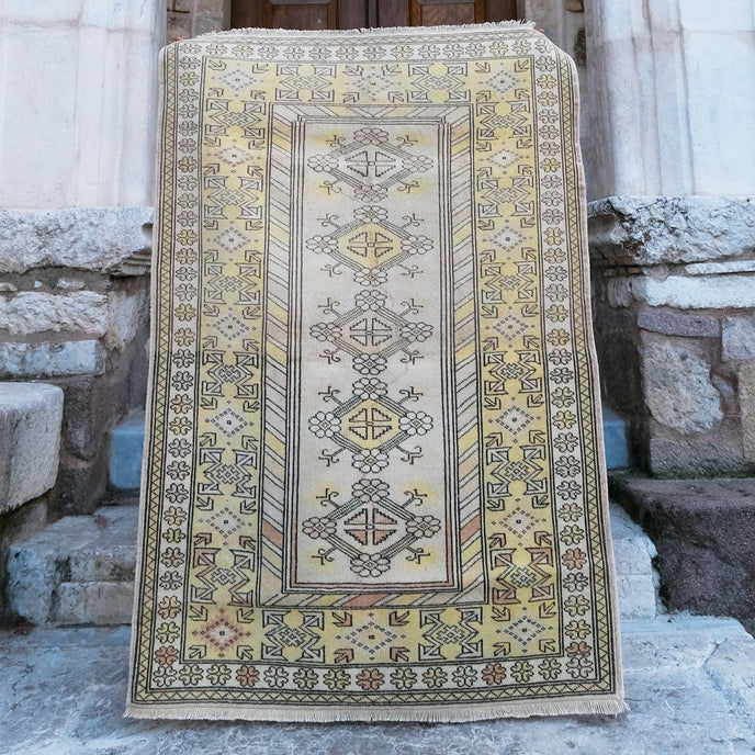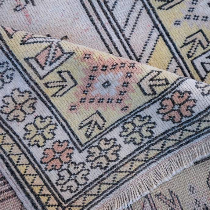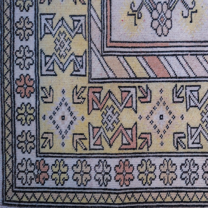 This Turkish handwoven vintage rug has a beautiful neutral background with yellow, salmon, and neutral accents. Milas.