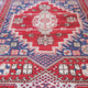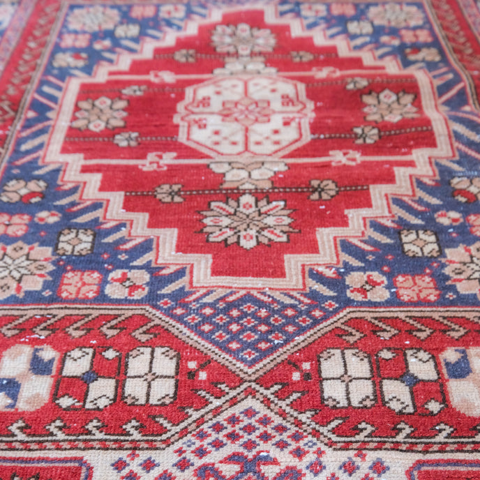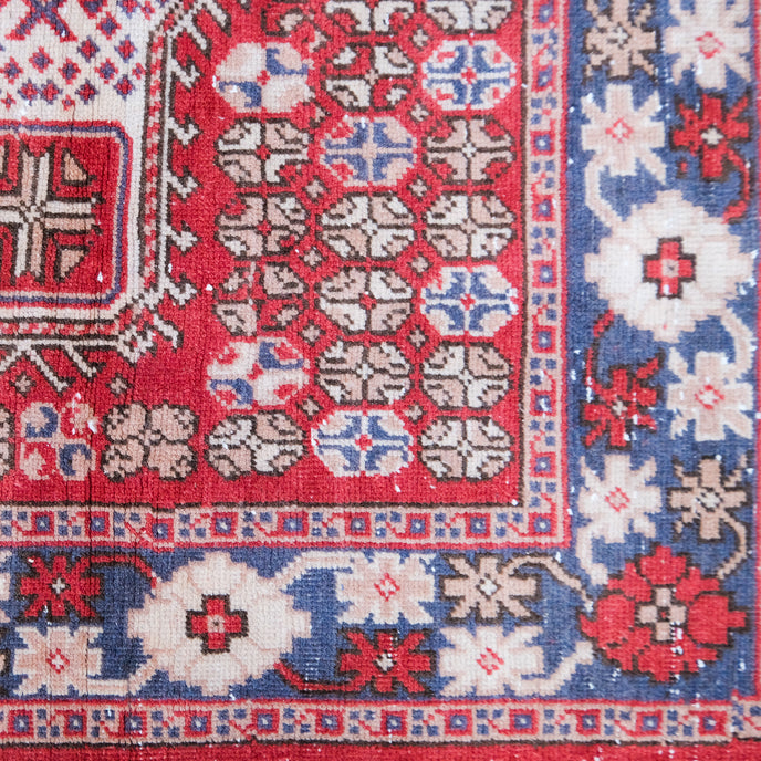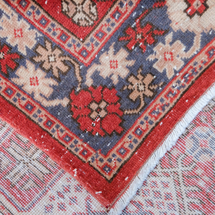 This Turkish handwoven vintage rug has a beautiful red background with blue and neutral accents. Kütahya.