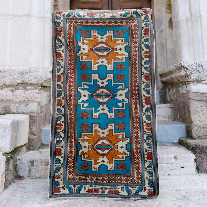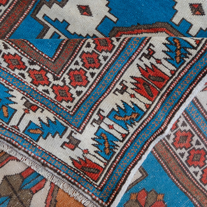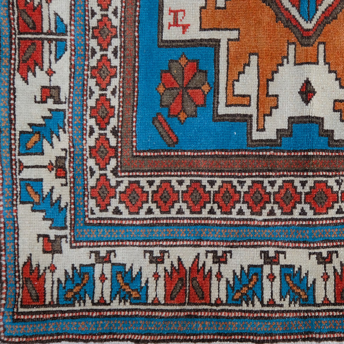 This Turkish handwoven vintage rug has a beautiful blue background with rust, red, and neutral accents. Balıkesir.