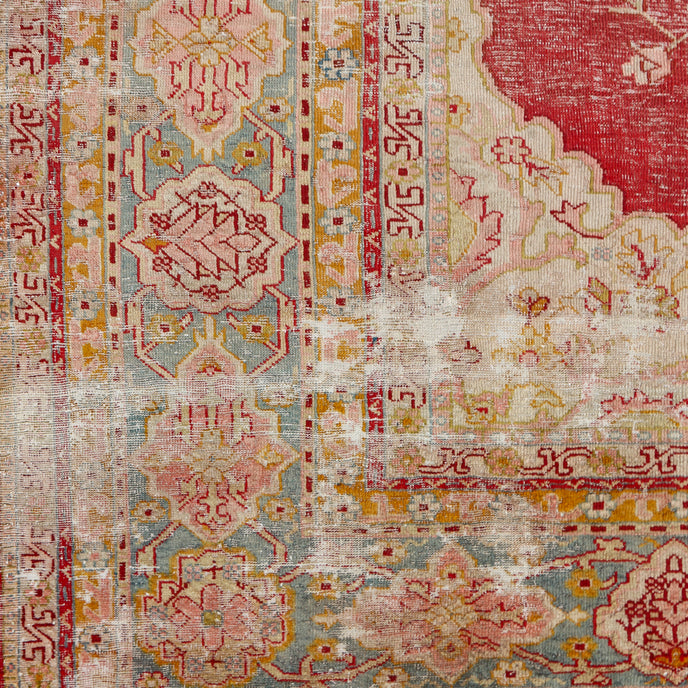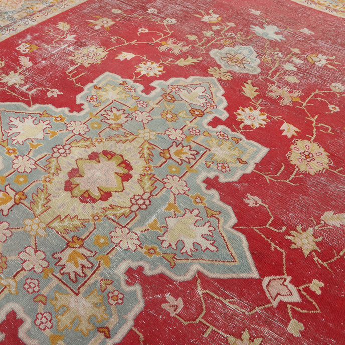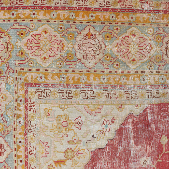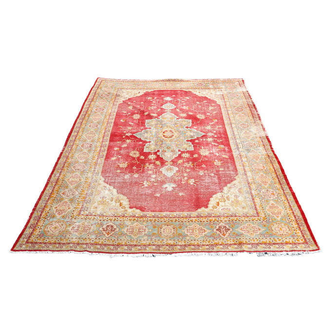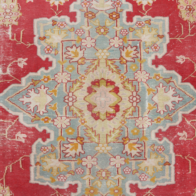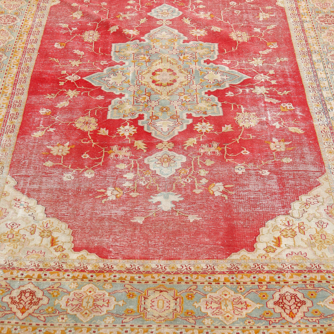 This Turkish handwoven vintage rug has a beautiful red background with gold, blue, and neutral accents. Sivas.