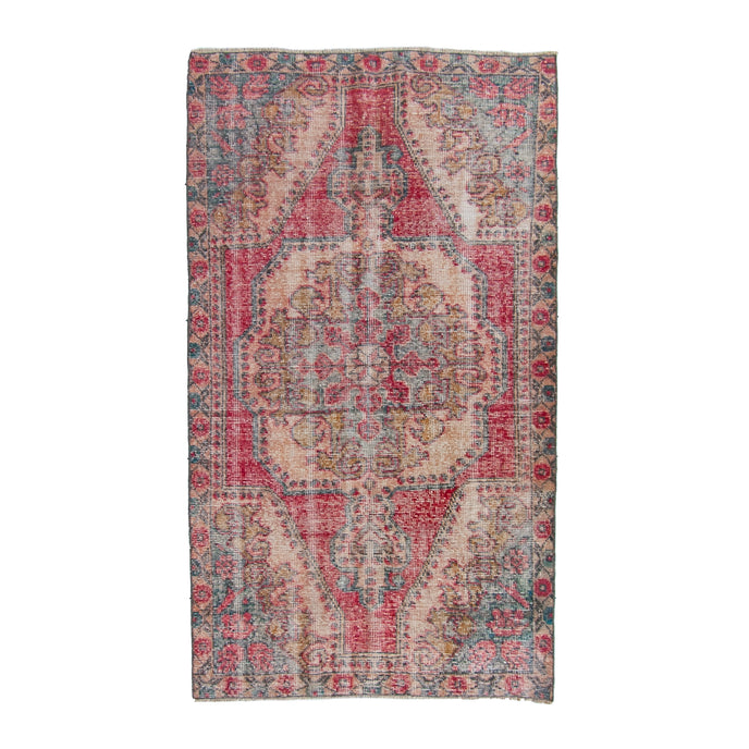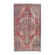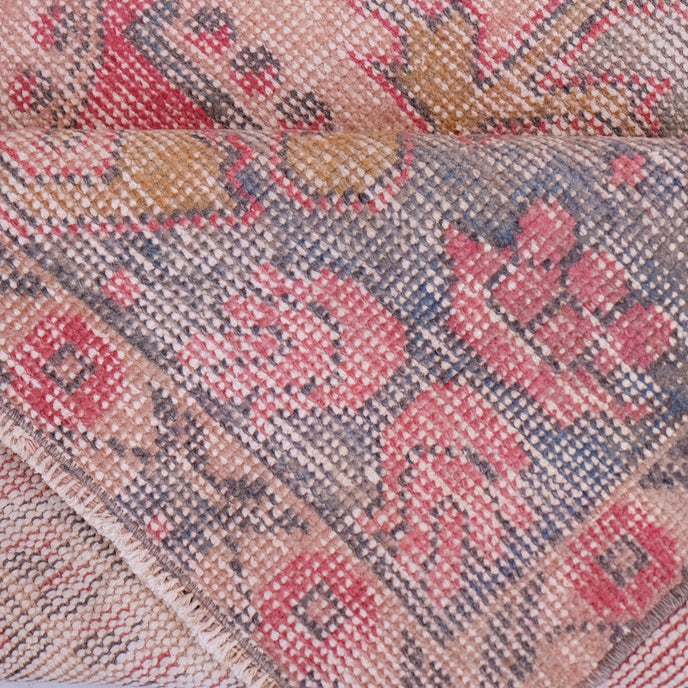 This Turkish handwoven vintage rug has a beautiful red background with gray, pink, mustard yellow, and neutral accents. Avanos.