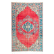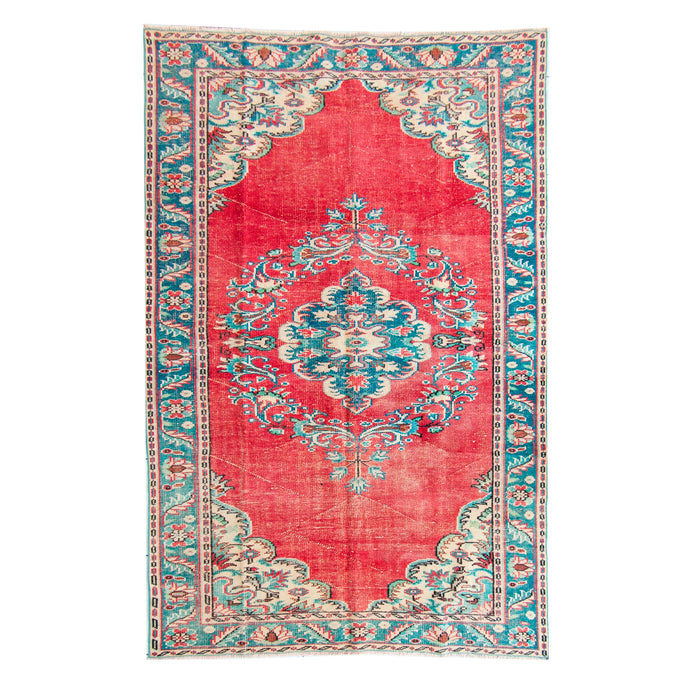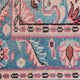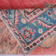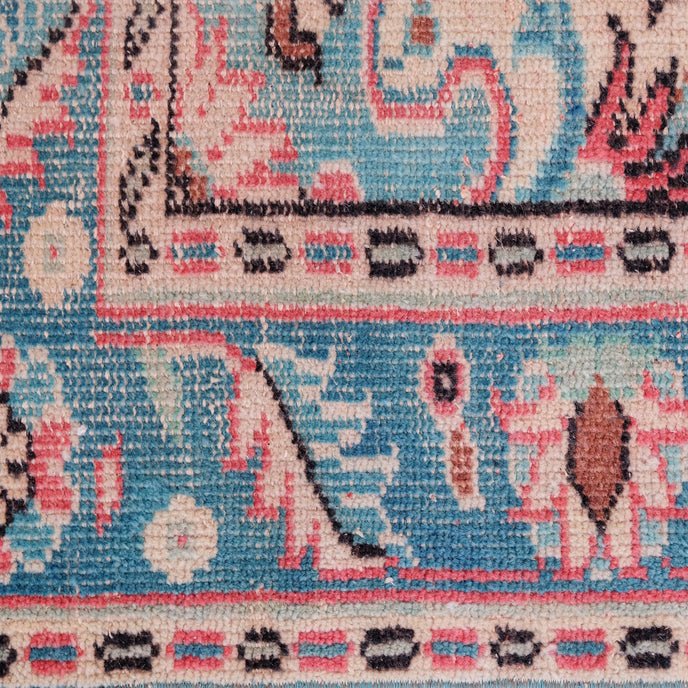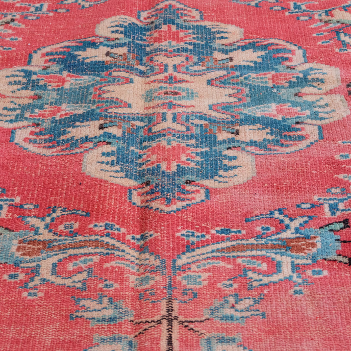 This Turkish handwoven vintage rug has a beautiful salmon background with blue, black, mint green, and neutral accents. Demirci.