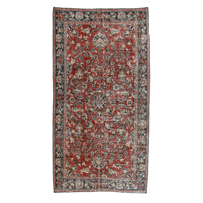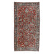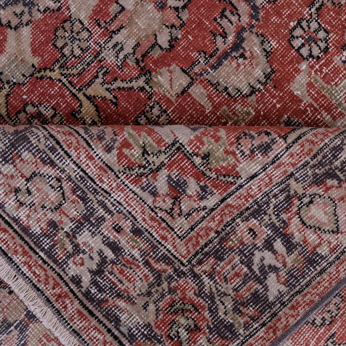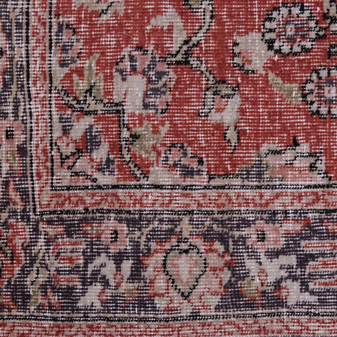 This Turkish handwoven vintage rug has a beautiful rusty red background with sage and gray and neutral accents. Isparta.