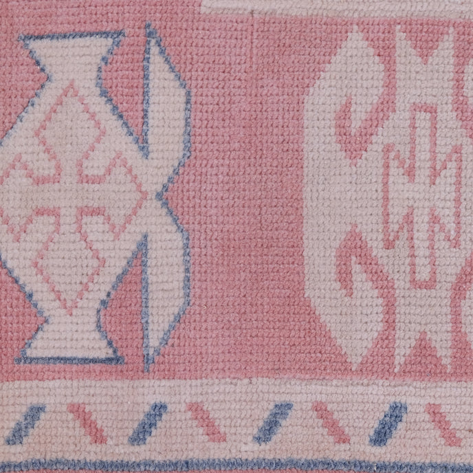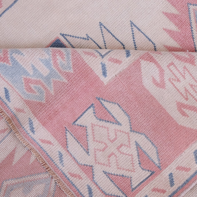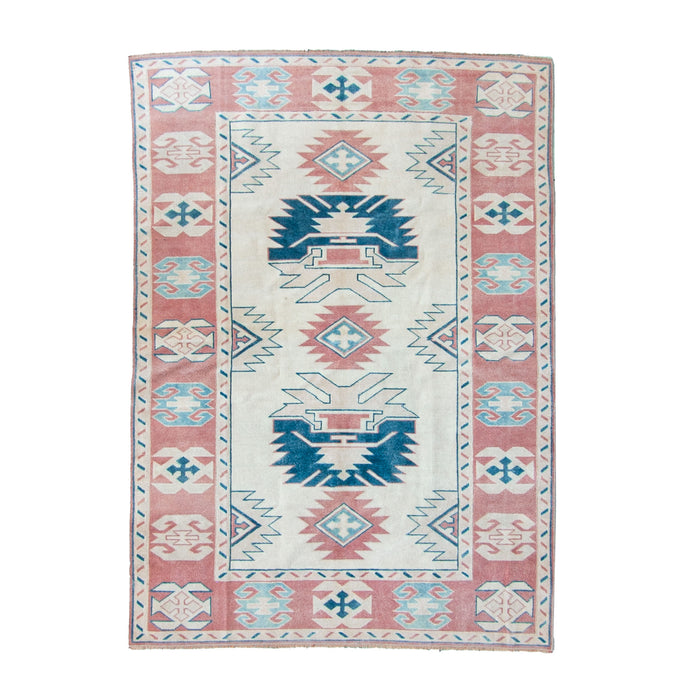 This Turkish handwoven vintage rug has a beautiful cream background with light blue, pink, and royal blue accents. Kars.