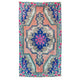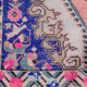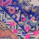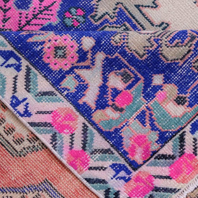 This Turkish handwoven vintage rug has a beautiful peach background with sage, hot pink, electric blue, and neutral accents. Avanos.