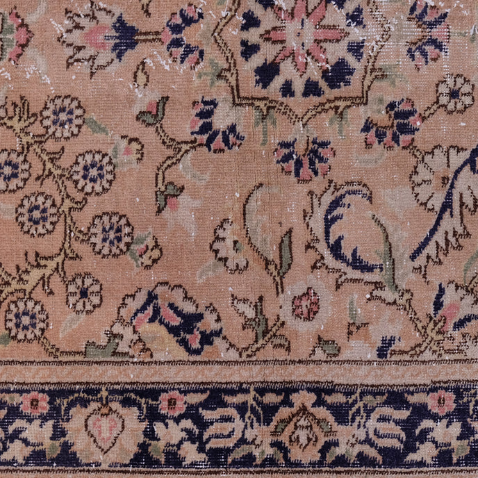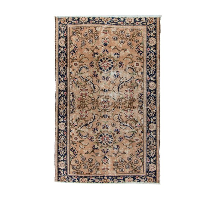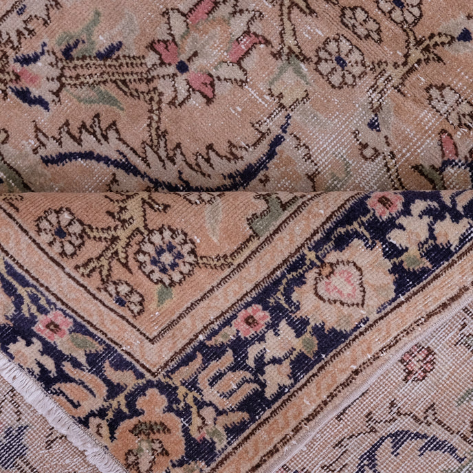This Turkish handwoven vintage rug has a beautiful sandy-neutral background with deep blue, pink, sage green, and neutral accents. Kütahya.