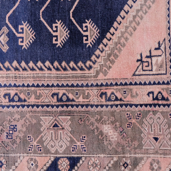 This Turkish handwoven vintage rug has a beautiful blue background with pink and neutral accents. Döşemealtı.