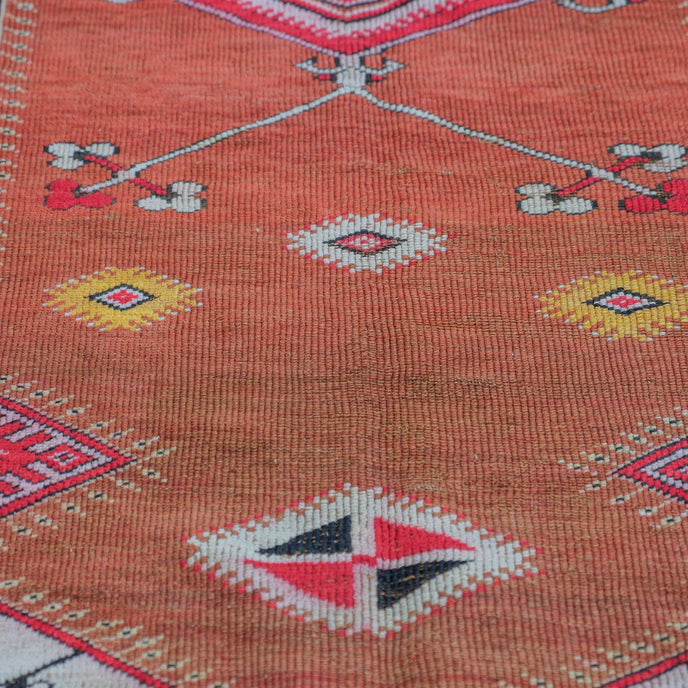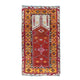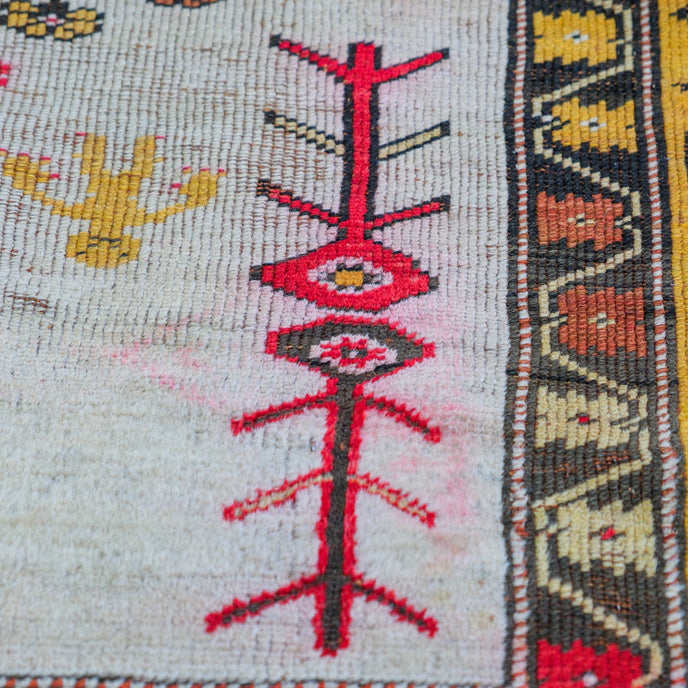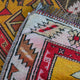 This vintage Turkish handwoven rug has a beautiful red background with yellow, gray, rusty orange, and neutral accents. Milan.