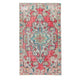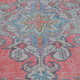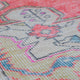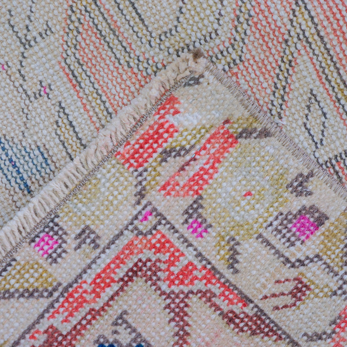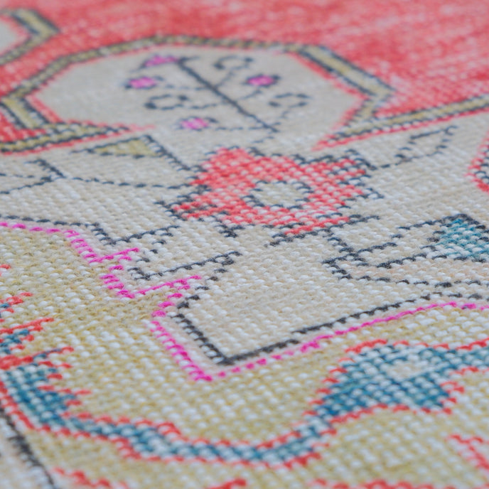 This Turkish handwoven vintage rug has a beautiful salmon background with lime green, aqua, hot pink, and charcoal neutral accents. Avanos.