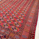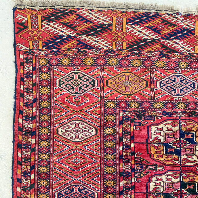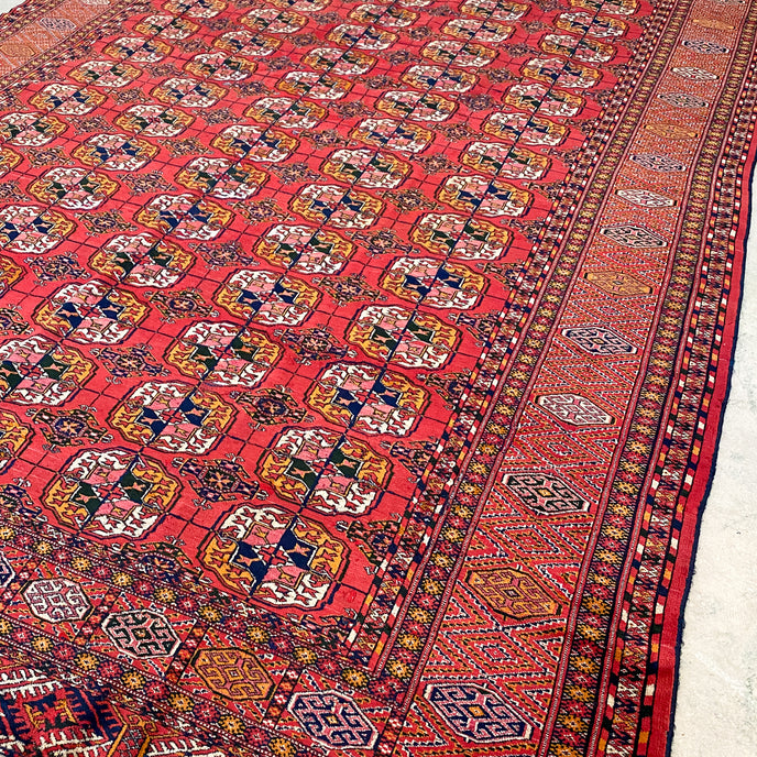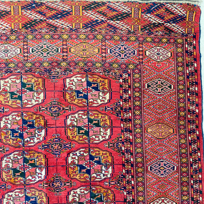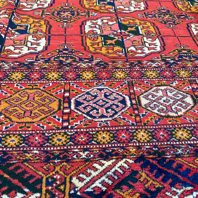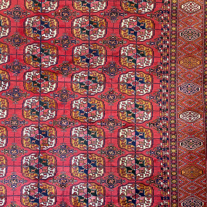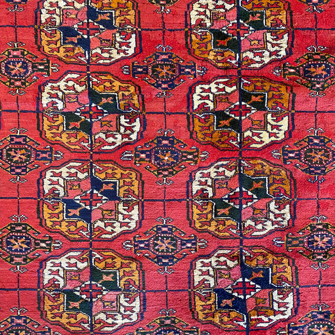 This Turkish handwoven antique rug has a gorgeous traditional background with blue, black, salmon, and gold accents. Perfect condition. Türkman Burhkara. 180 years old. Original vegetable dye colors. Very good pile, pristine condition, shines like silk.