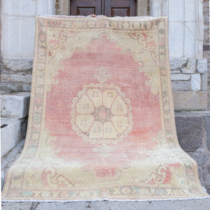 This vintage Turkish handwoven rug has a beautiful pink background with pink, off white, blue, gray and neutral accents. Sivas.
