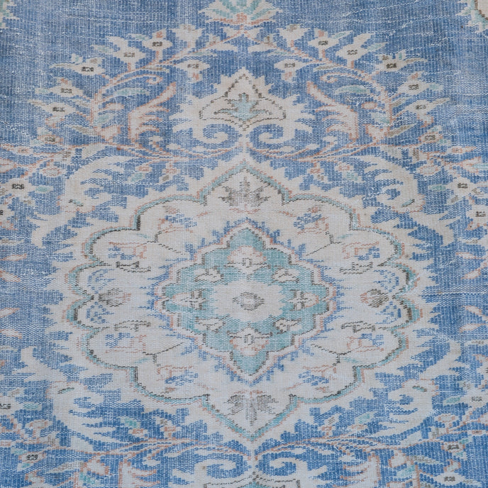 This vintage Turkish handwoven rug has a beautiful blue background with neutral accents. Demirci.
