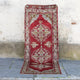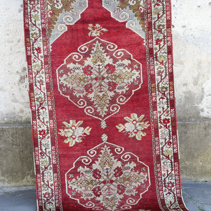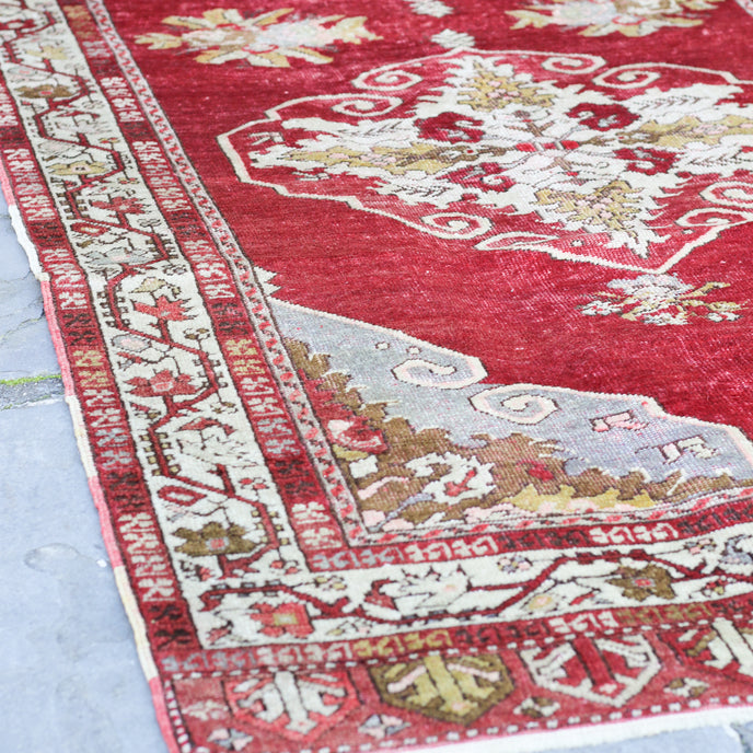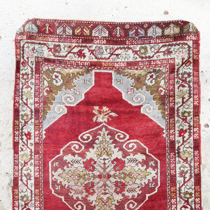This handwoven Turkish rug is an antique Kırşehir. Deep red with light blue/gray, green and cream accents. Original colors.