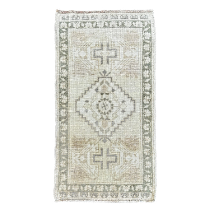 This vintage Turkish handwoven rug has a beautiful neutral background with tan and green accents.