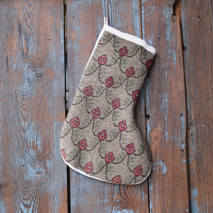Our Handmade Christmas Stockings are a delightful way to elevate your holiday traditions. These one-of-a-kind stockings are the perfect blend of eco-consciousness and rustic charm, each adorned with salvaged vintage rug pieces and featuring a backing of soft cotton blend fabric, making them not just a festive accessory but a testament to sustainability and comfort.
