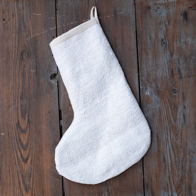 The uniqueness of each stocking lies in the distinct patterns and textures of the hemp fabric, ensuring no two stockings are alike. Additionally, you have the option to choose either a left or right facing stocking, adding a personal touch to your Christmas decor.