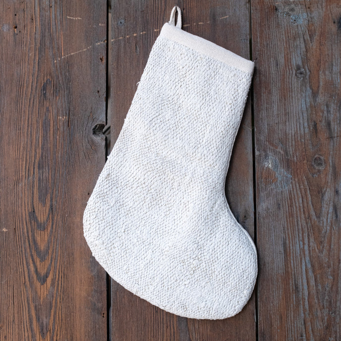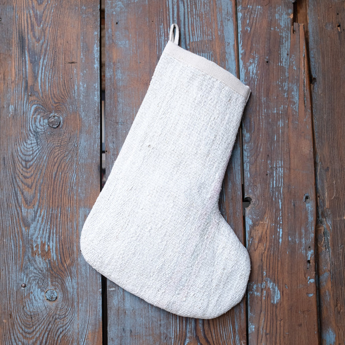 The uniqueness of each stocking lies in the distinct patterns and textures of the hemp fabric, ensuring no two stockings are alike. Additionally, you have the option to choose either a left or right facing stocking, adding a personal touch to your Christmas decor.
