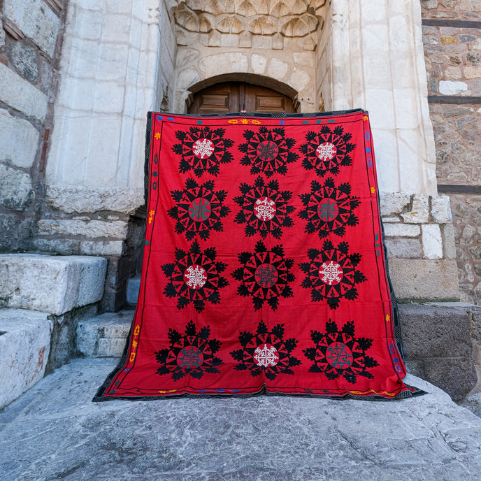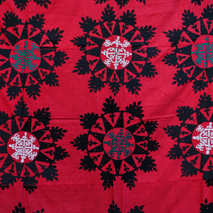 This beautiful vintage tribal textile is hand embroidered and perfect for adding color and texture to any space. 6’6x7’9.