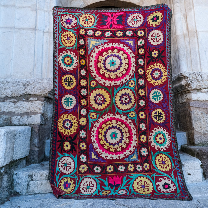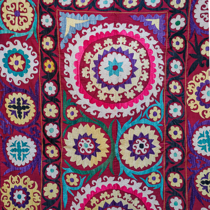 This beautiful vintage tribal textile is hand embroidered and perfect for adding color and texture to any space. 4’9x7’5.