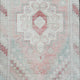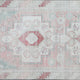This vintage Turkish handwoven rug has a beautiful pink background with blue, gray, and neutral accents.