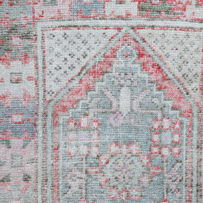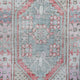 This vintage Turkish handwoven rug has a beautiful pink background with blue, gray, green, and neutral accents.