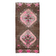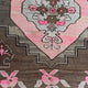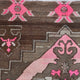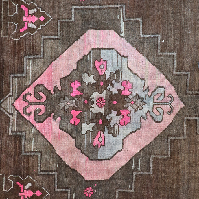 This vintage Turkish handwoven rug has a beautiful brown background with tan, hot pink, pink, and neutral accents.