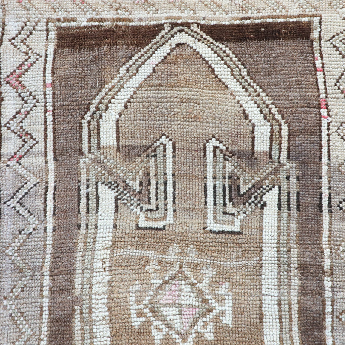This vintage Turkish handwoven rug has a beautiful brown background with white and tan accents.