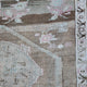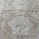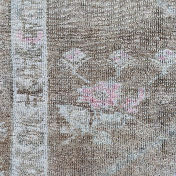 This vintage Turkish handwoven rug has a beautiful beige background with tan, brown, soft green, pink, and neutral accents.