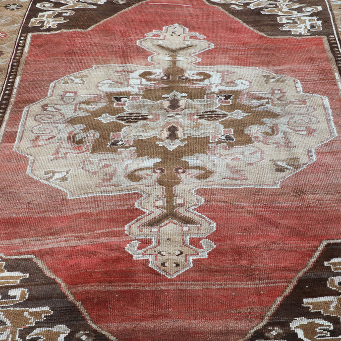 This vintage Turkish handwoven rug has a beautiful rusty red background with tan, brown, gray, and neutral accents.