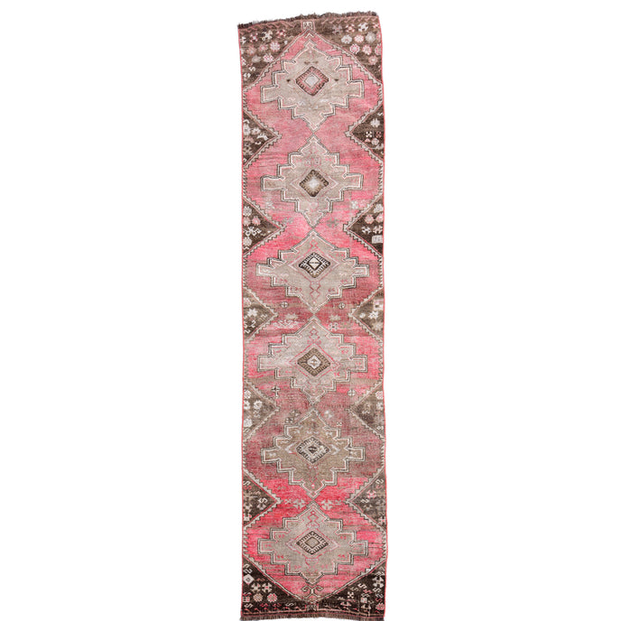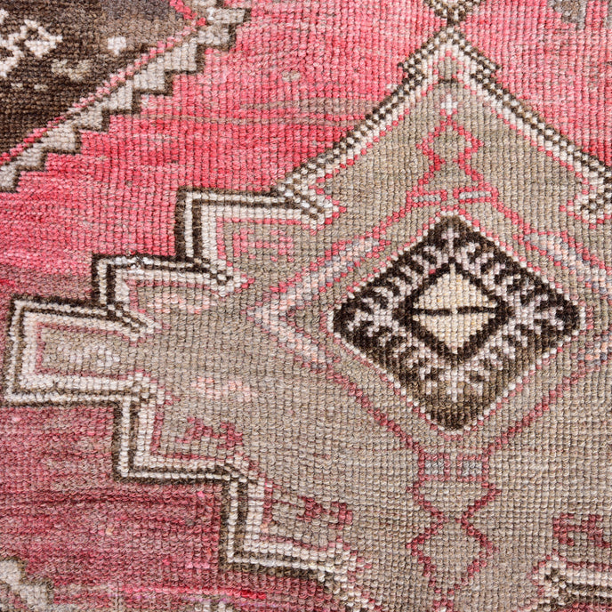 This vintage Turkish handwoven rug has a beautiful pinkish red background with brown accents.