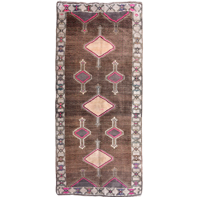 This vintage Turkish handwoven rug has a beautiful brown background with gray, peach, pink, and neutral accents.