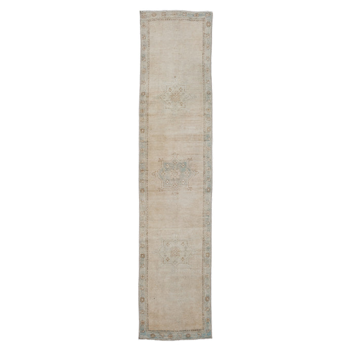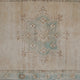 This vintage Turkish handwoven rug has a beautiful neutral background with soft aqua, tan, and neutral accents.