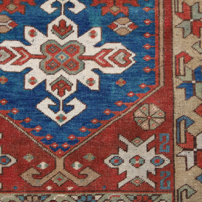 This vintage Turkish handwoven rug has a beautiful red background with blue, gold, green, tan, and neutral accents.