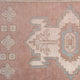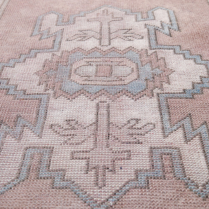 This vintage Turkish handwoven rug has a beautiful neutral mauve background with soft blue and neutral accents.