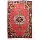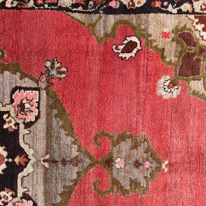 This vintage Turkish handwoven rug has a beautiful coral background with green, tan, black, pink, and neutral accents.