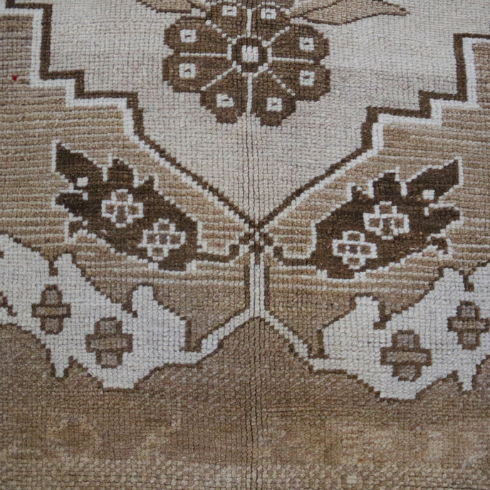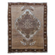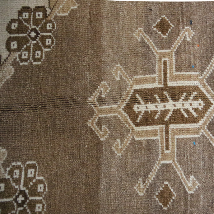 This vintage Turkish handwoven rug has a beautiful brown background with tan and dark brown accents.