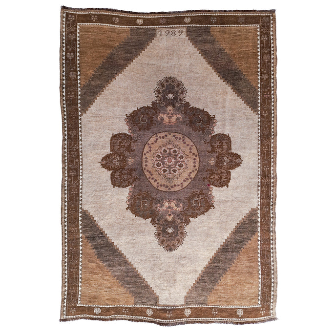 This vintage Turkish handwoven rug has a beautiful off white background with camel, tan, brown, and gray accents.