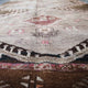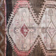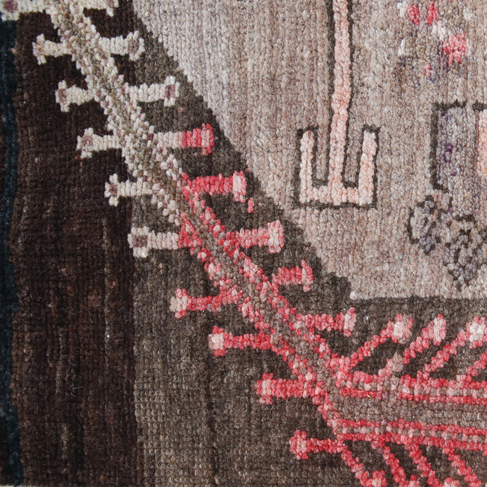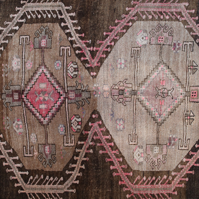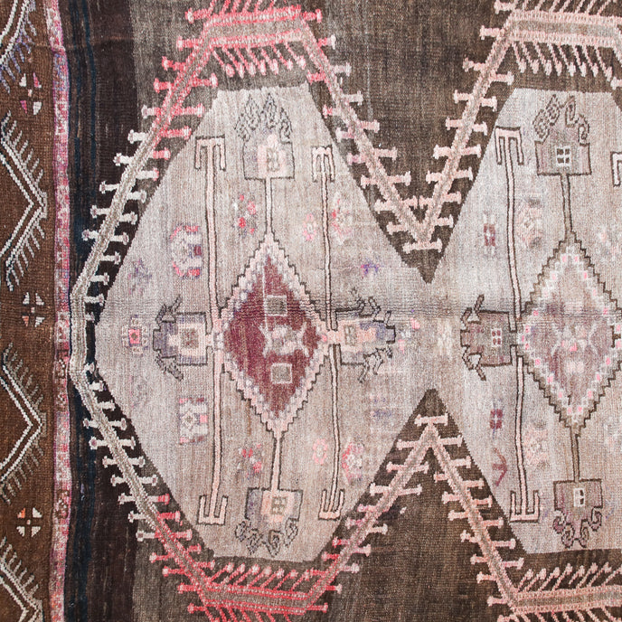 This vintage Turkish handwoven rug has a beautiful brown background with beige and pink accents.