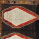 This vintage Turkish handwoven rug has a beautiful black background with brown, yellow, tan, orange, and gray accents.