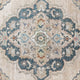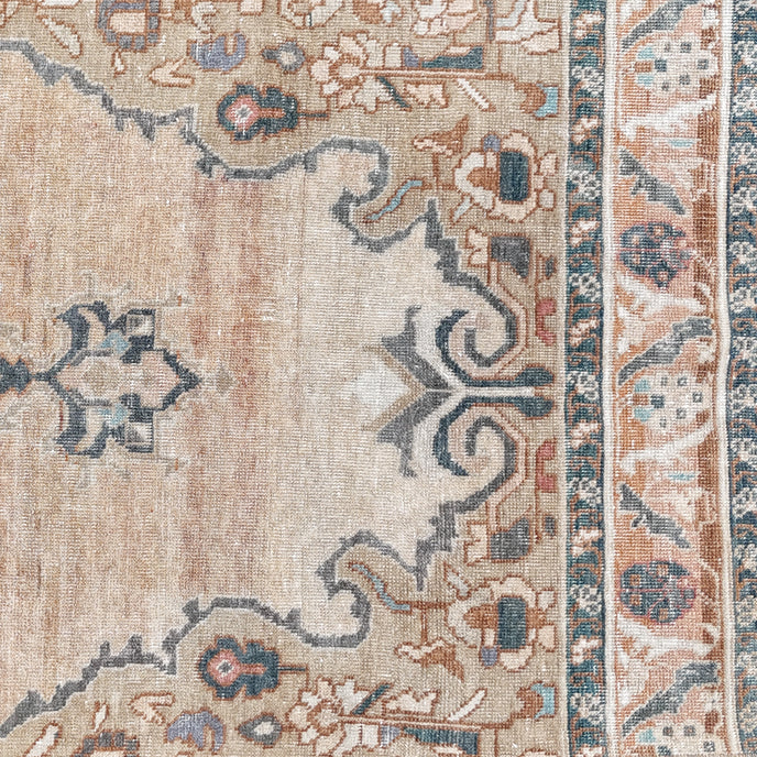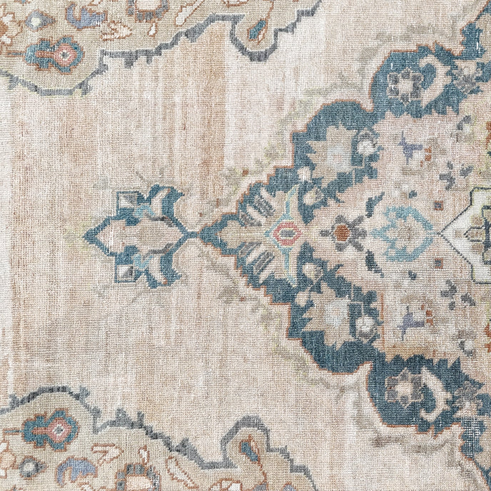 This vintage Turkish handwoven rug has a beautiful neutral background with blue, rust, peach, brown, and gold accents.