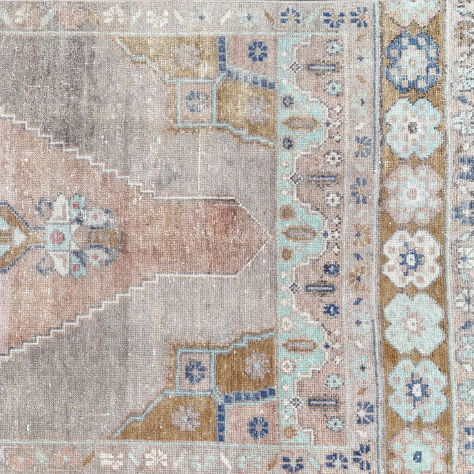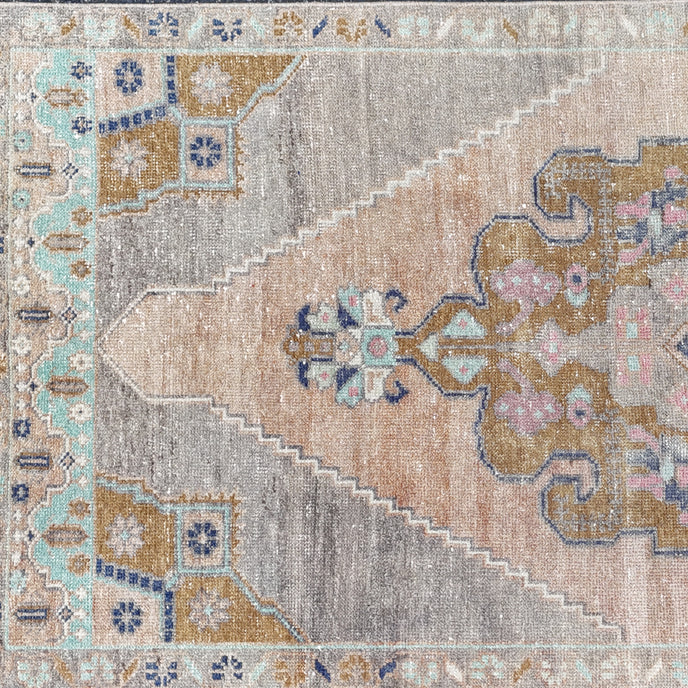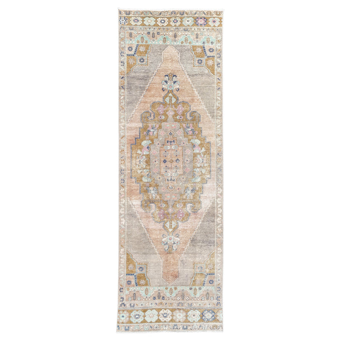 This vintage Turkish handwoven rug has a beautiful neutral background with peach, gray, green, brown, gold and neutral accents.
