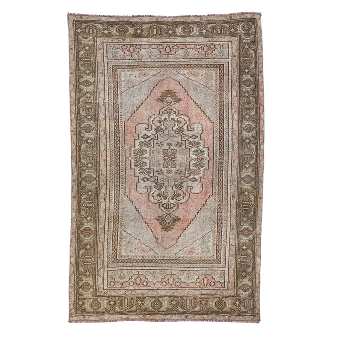 This vintage Turkish handwoven rug has a beautiful neutral background with peach and brown accents.