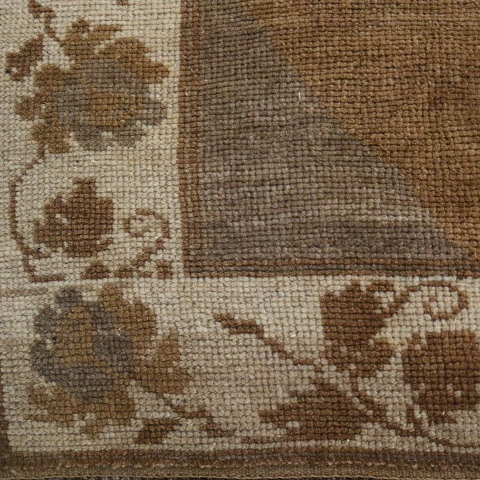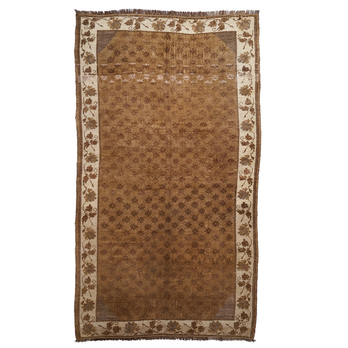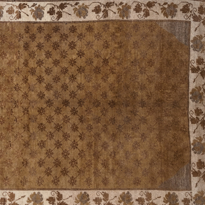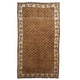 This vintage Turkish handwoven rug has a beautiful brown background with beige and gray accents.