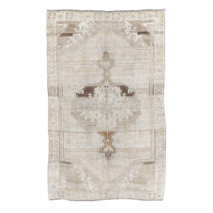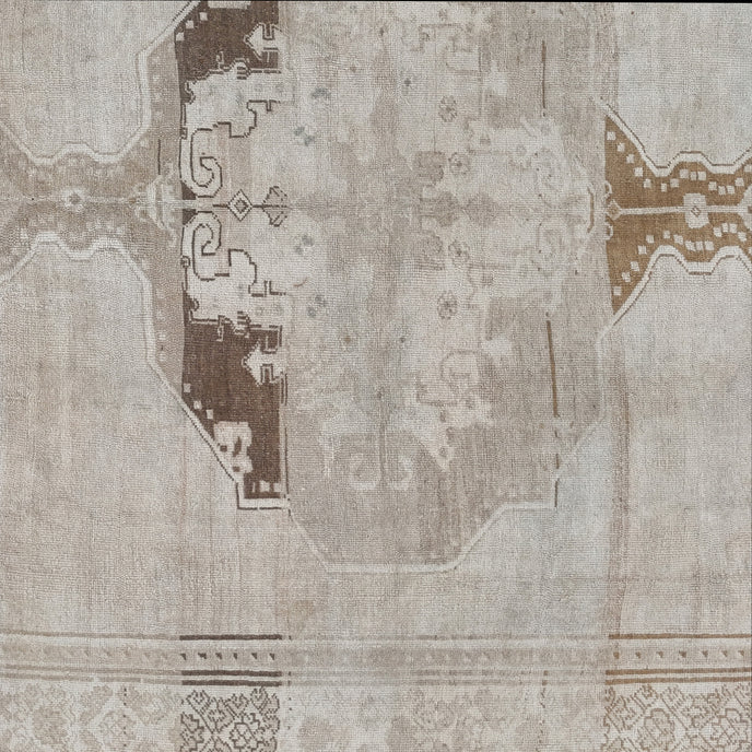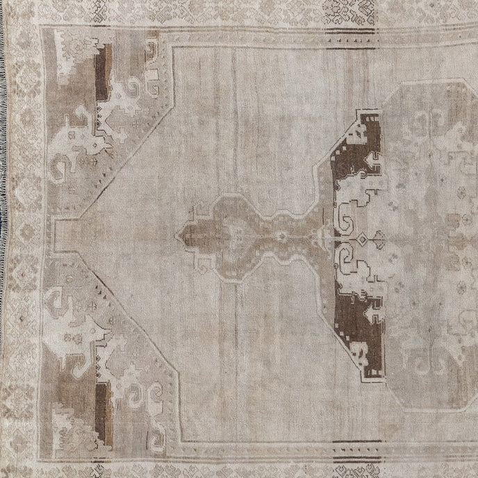This vintage Turkish handwoven rug has a beautiful neutral background with brown accents.